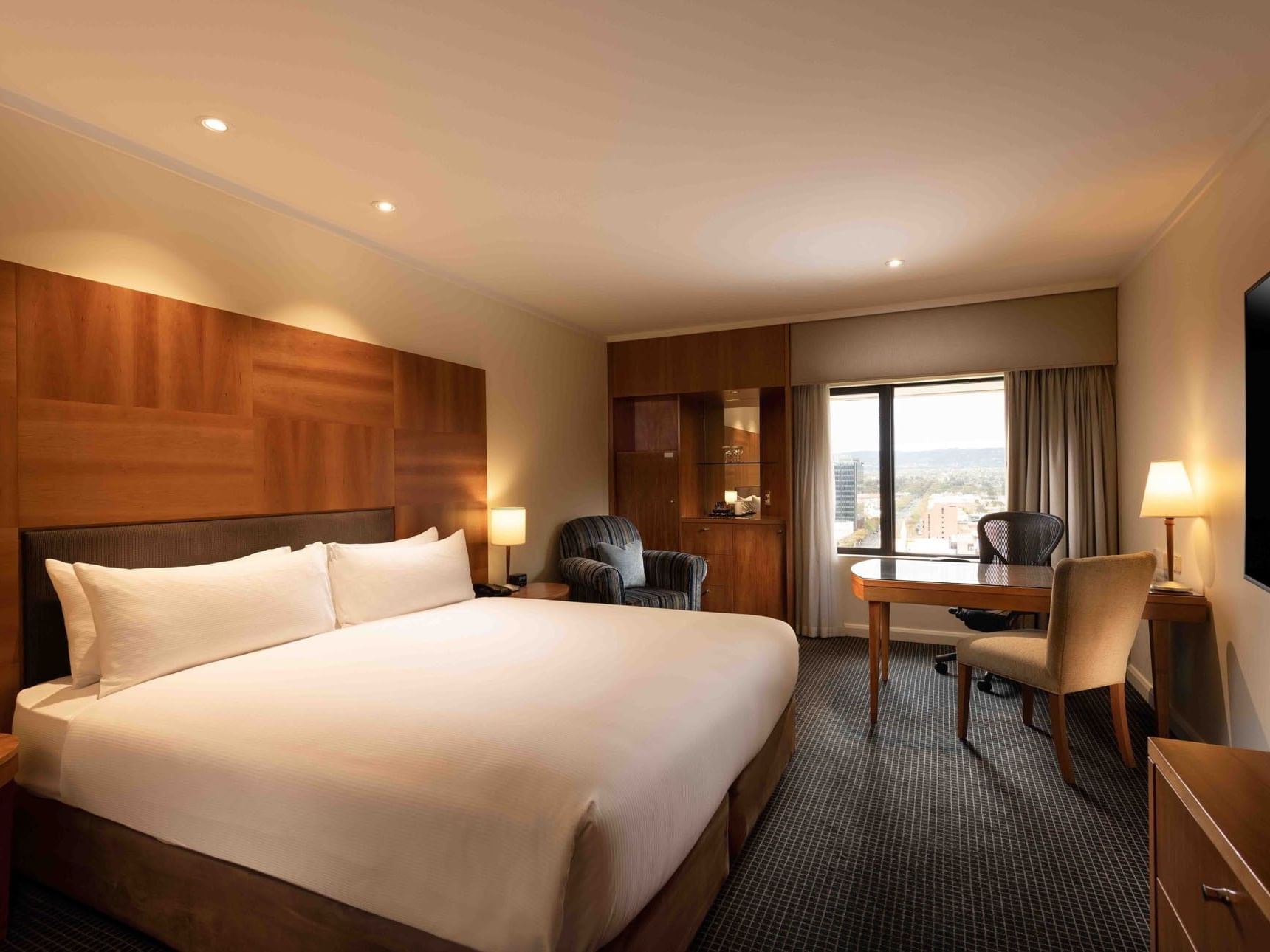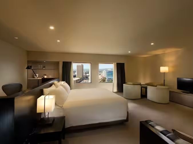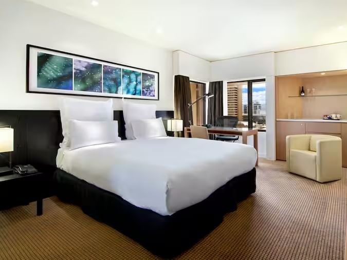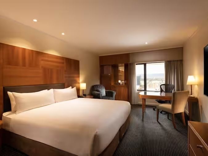 The Accessible King is a fully refurbished, city view room designed for comfort and ease, featuring a Serenity king bed and an accessible bathroom with grab rails and walk in shower. Guests also enjoy a work desk, Chromecast TV, minibar, complimentary Wi Fi, 24 hour room service, and access to the gym and swimming pool.