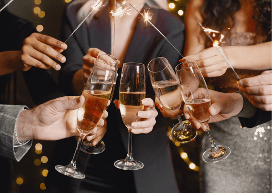 Group of women celebrating with gold balloons and sparklers amid falling confetti at Amora Hotel Jamison Sydney